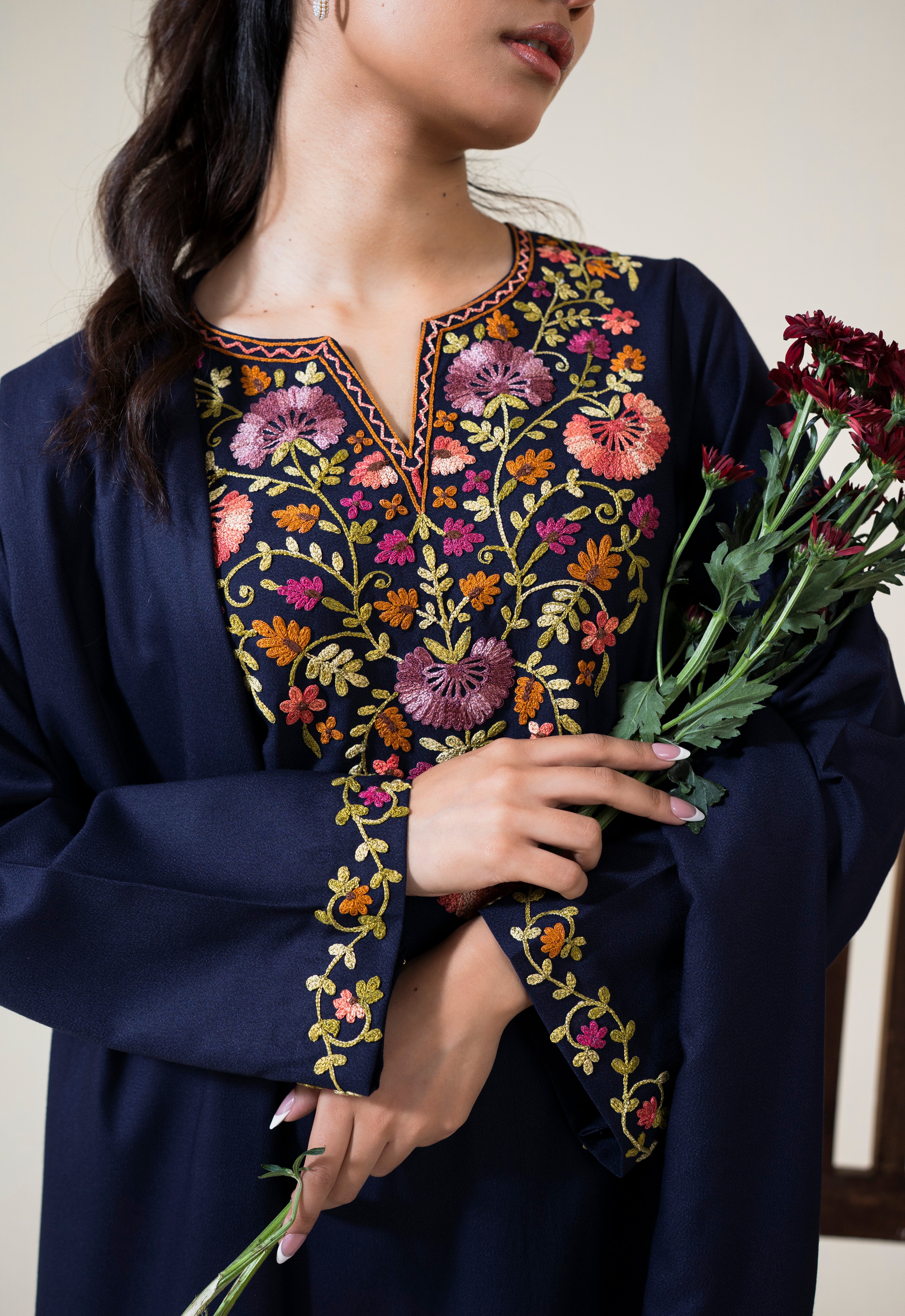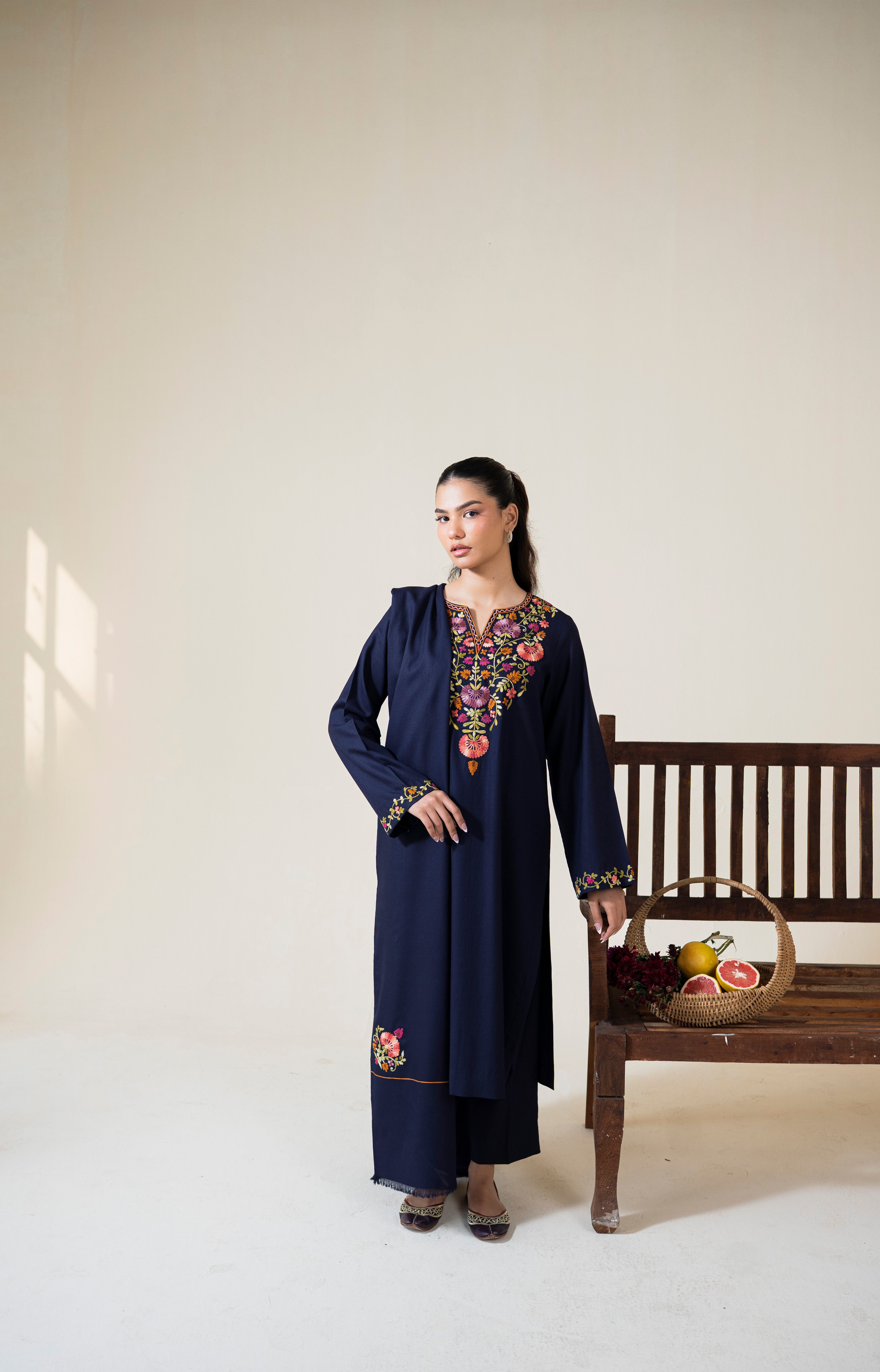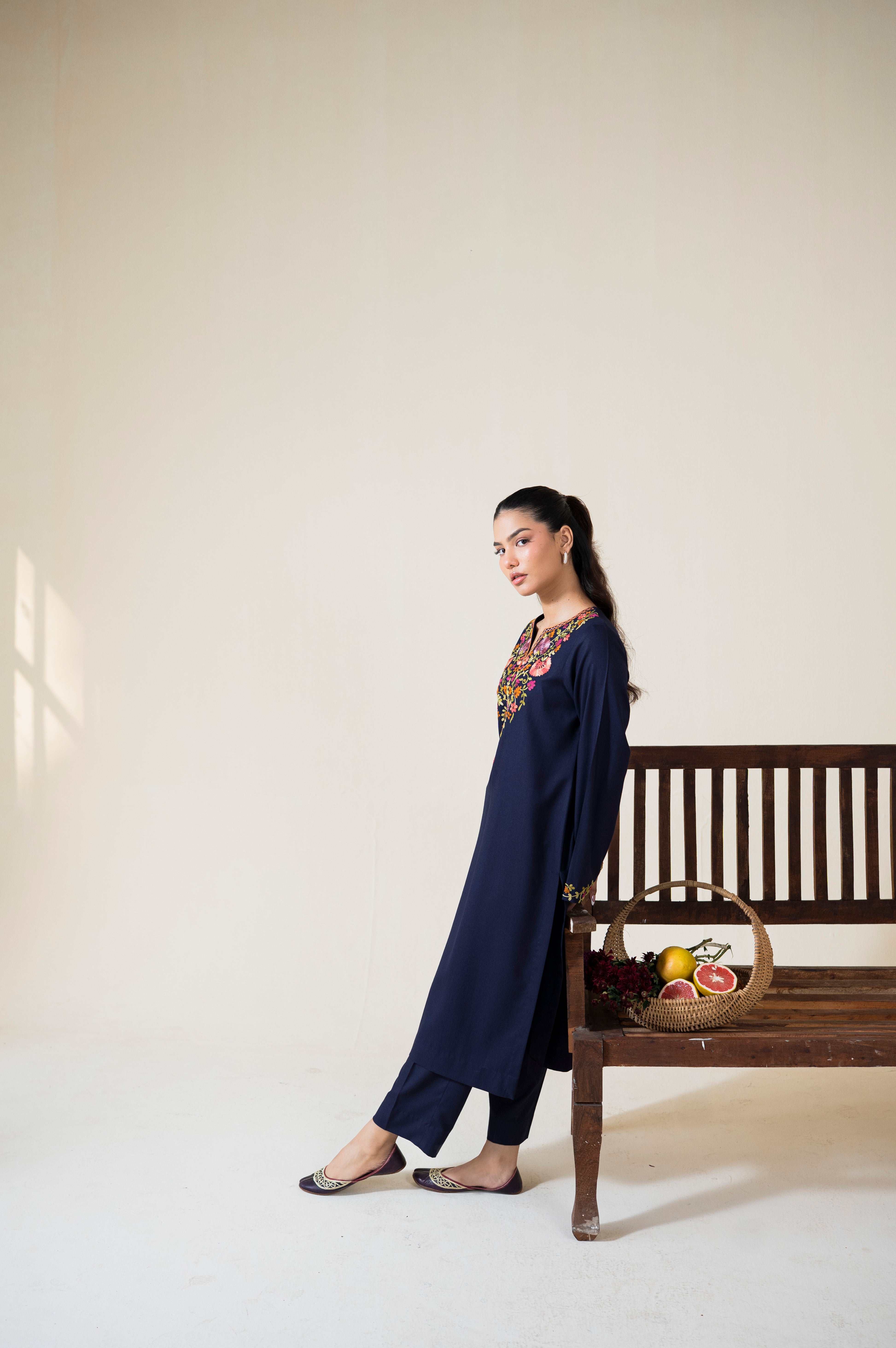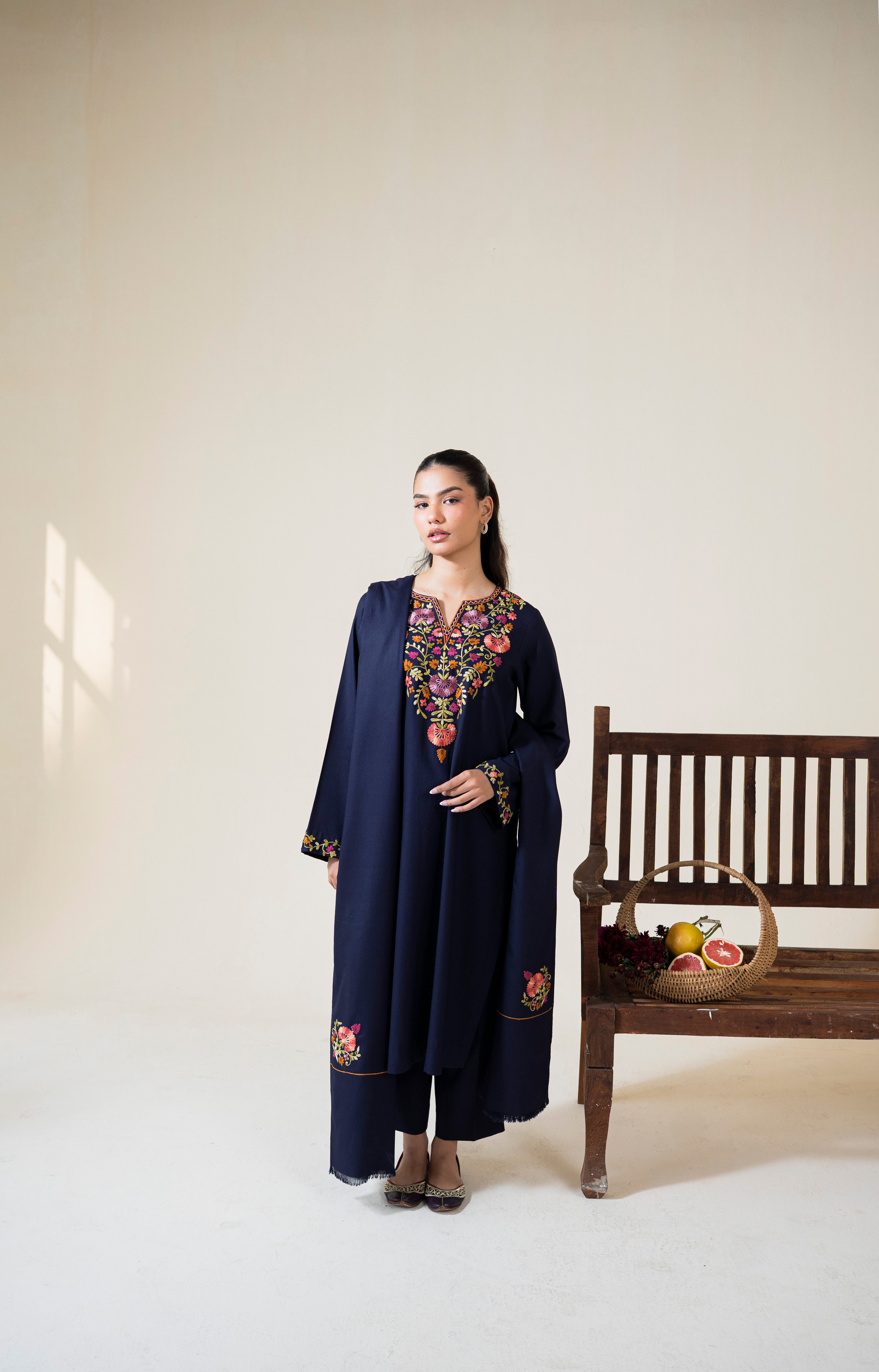 In a deep navy blue tone, Bloom brings a clean and polished winter look. The wool merina fabric keeps you comfortable all day long, while the straight trouser and matching shawl complete the outfit. It’s a great choice for both casual and semi-formal settings.