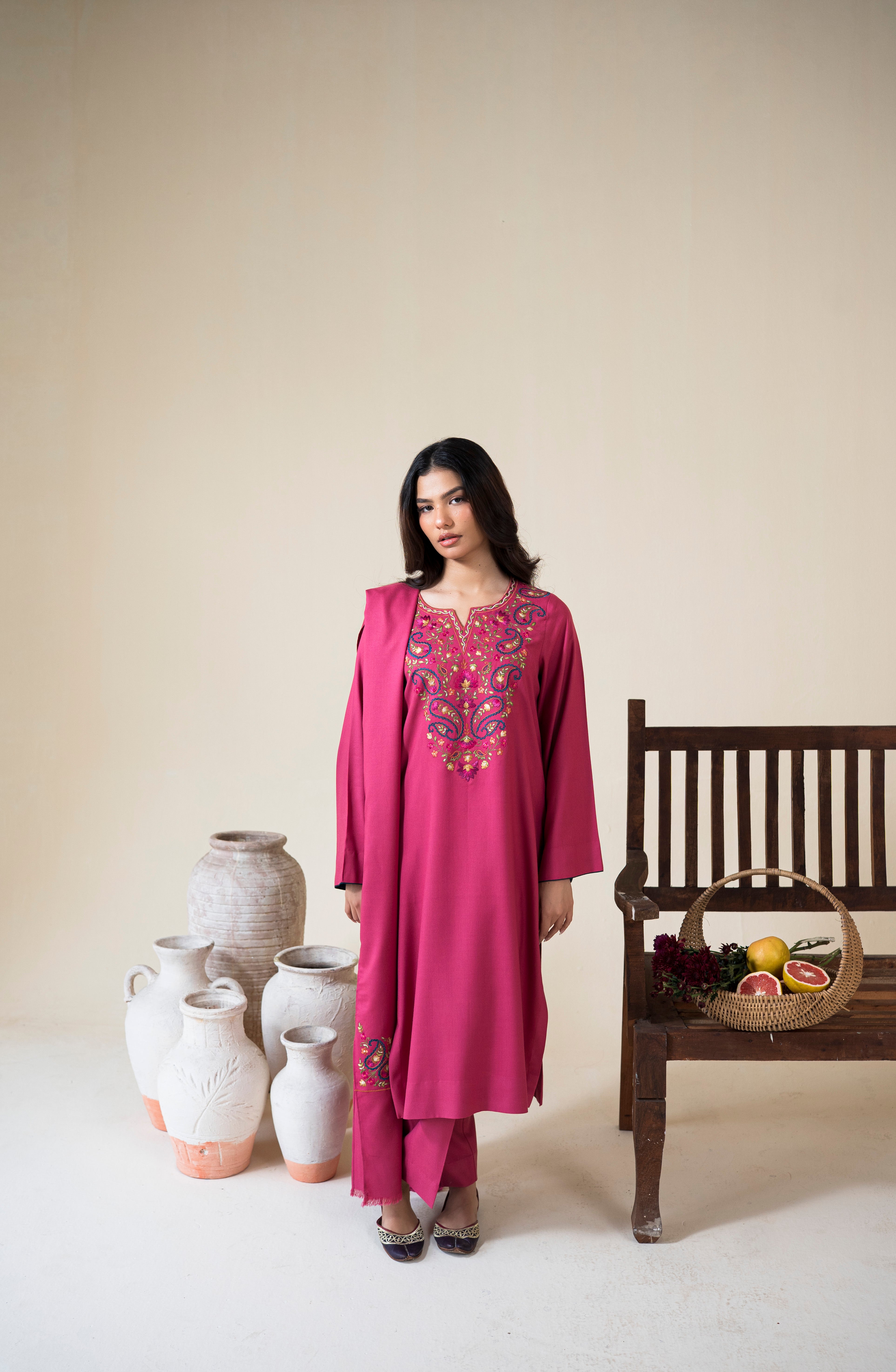 Breeze comes in a soft pink shade that looks light and pleasant for winter days. Made with wool merina, it includes a straight trouser and a shawl for a complete and easy-to-style outfit. Simple, warm, and perfect for daytime wear.