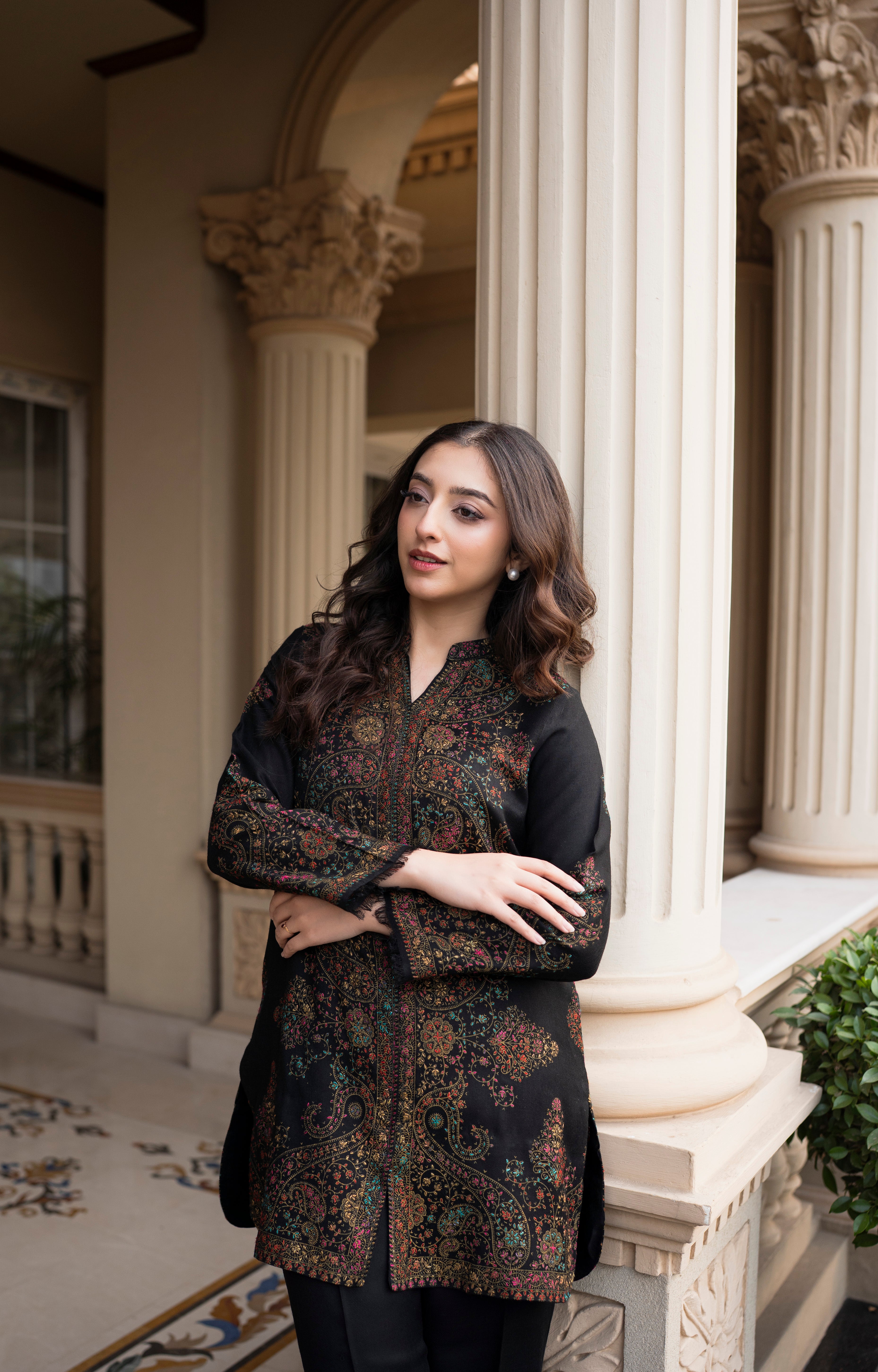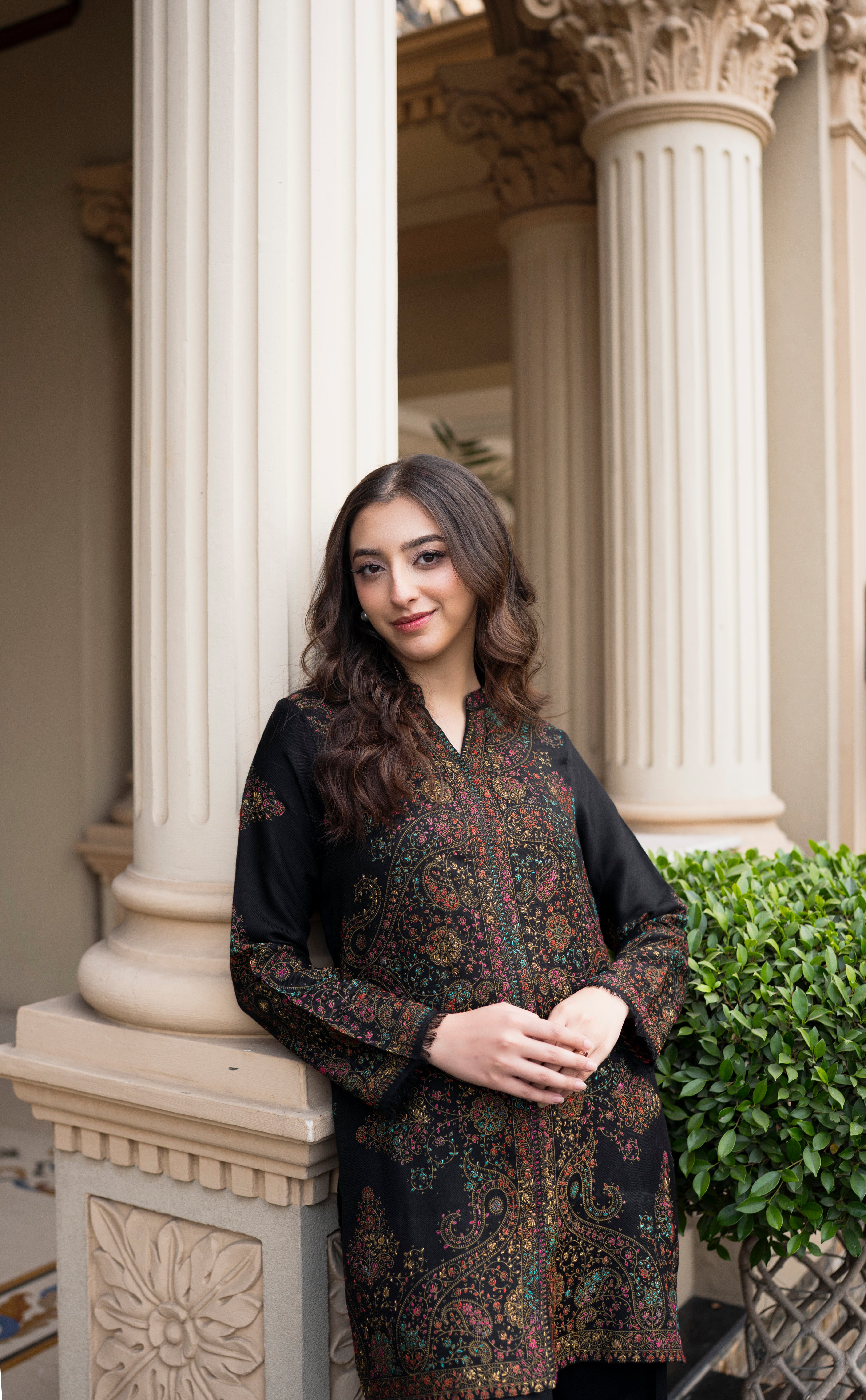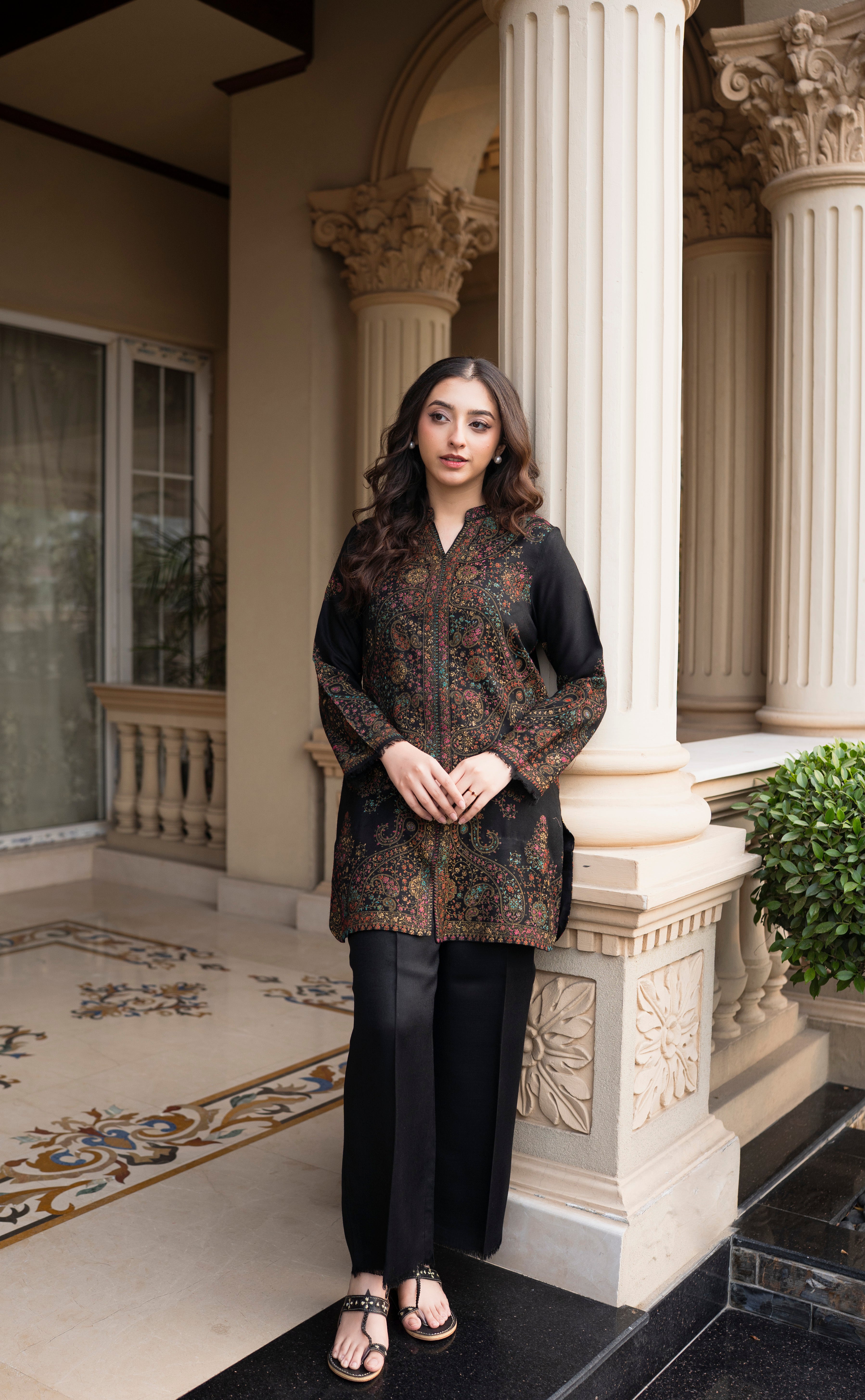 Chocó is a winter outfit from Aisling by Nirmal’s Pashm Pashmina Edit 2026. The shirt is made in Pashmina and features detailed all-over pattern work with a straight, clean cut. The neckline, front panel, and sleeves carry intricate design detailing, finished neatly at the hem. It is paired with matching Pashmina culottes that offer a relaxed and comfortable fit while maintaining a balanced silhouette. The deep chocó tone makes this article suitable for winter wear, everyday use, and casual to semi-formal occasions.