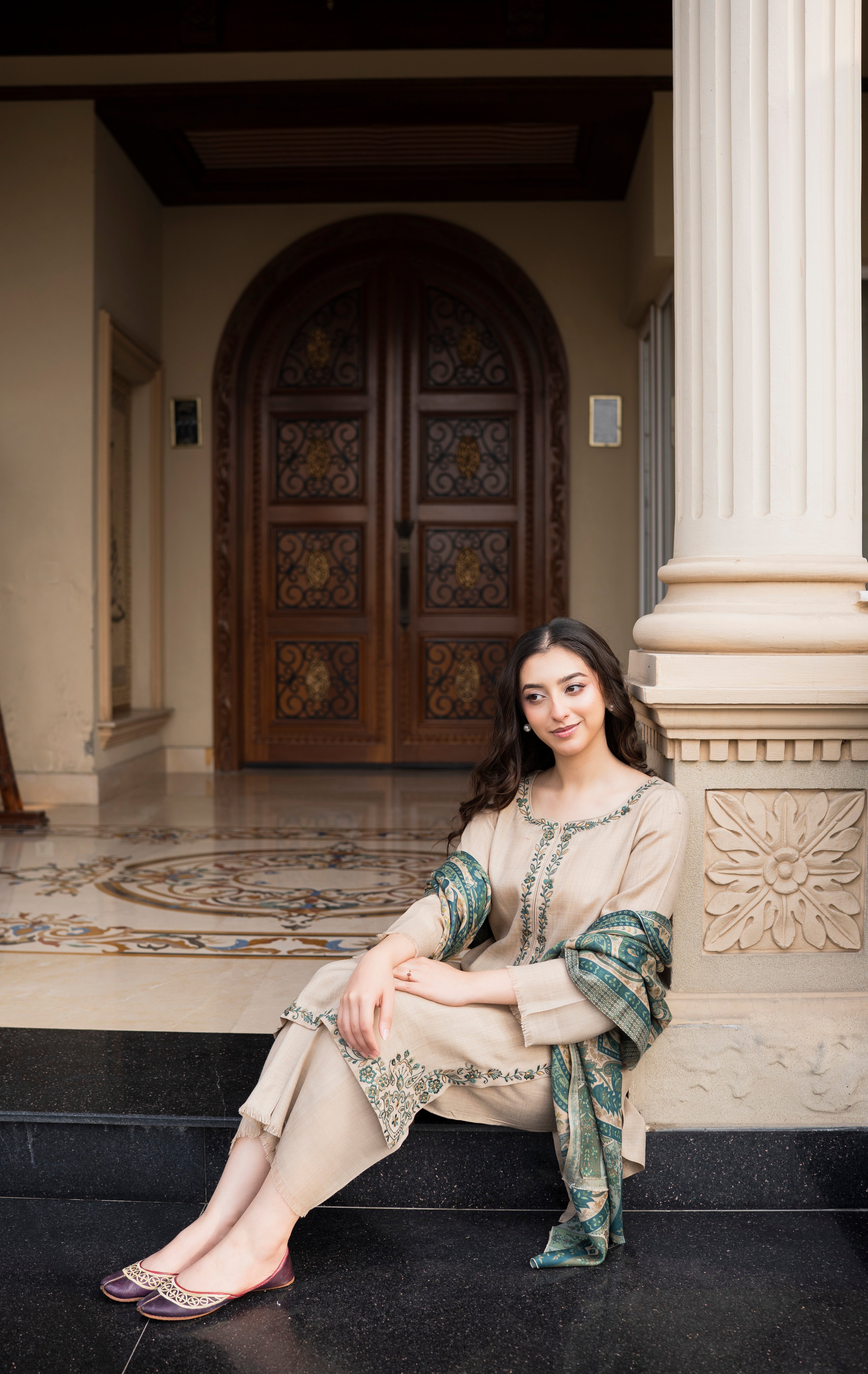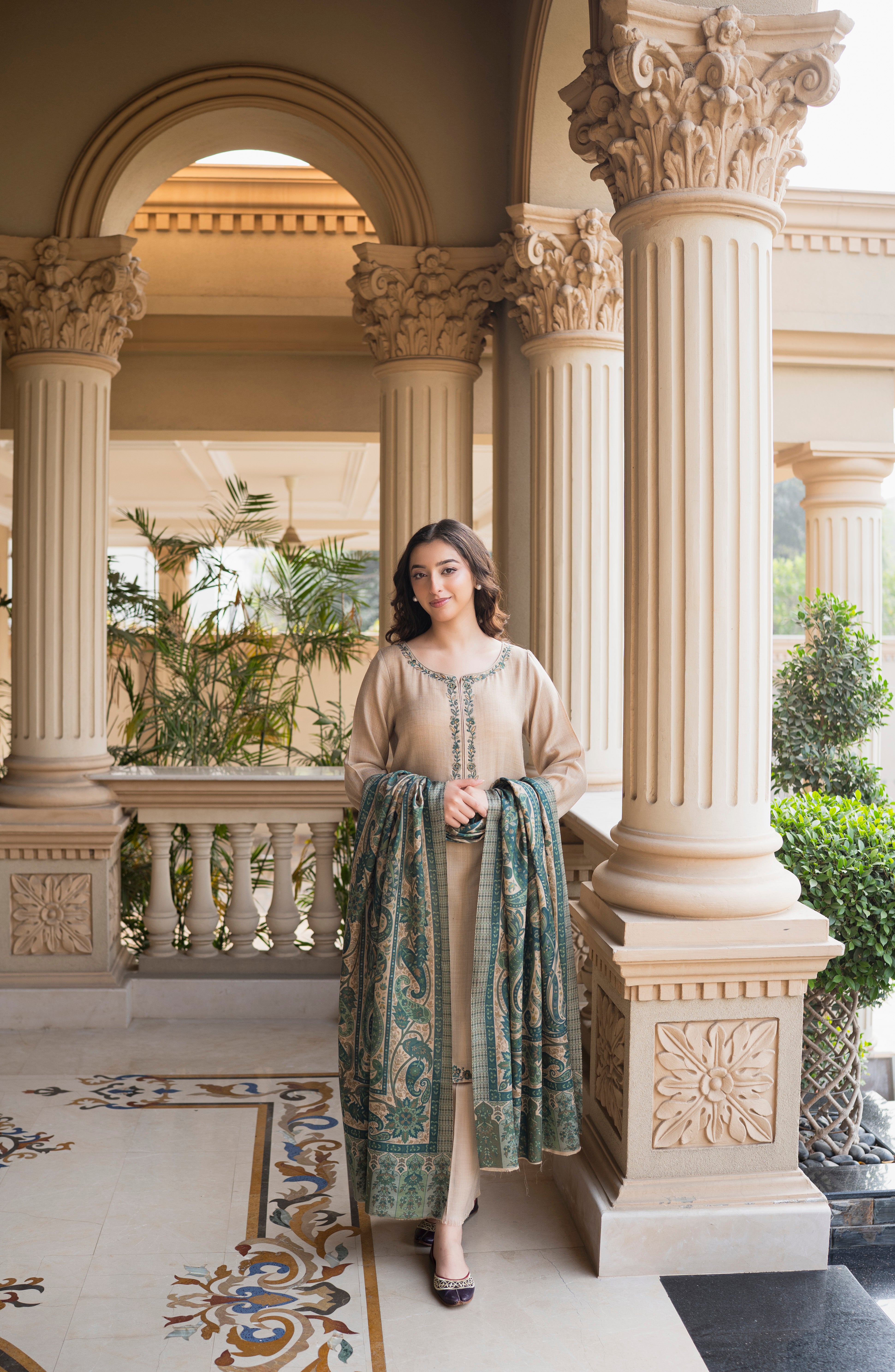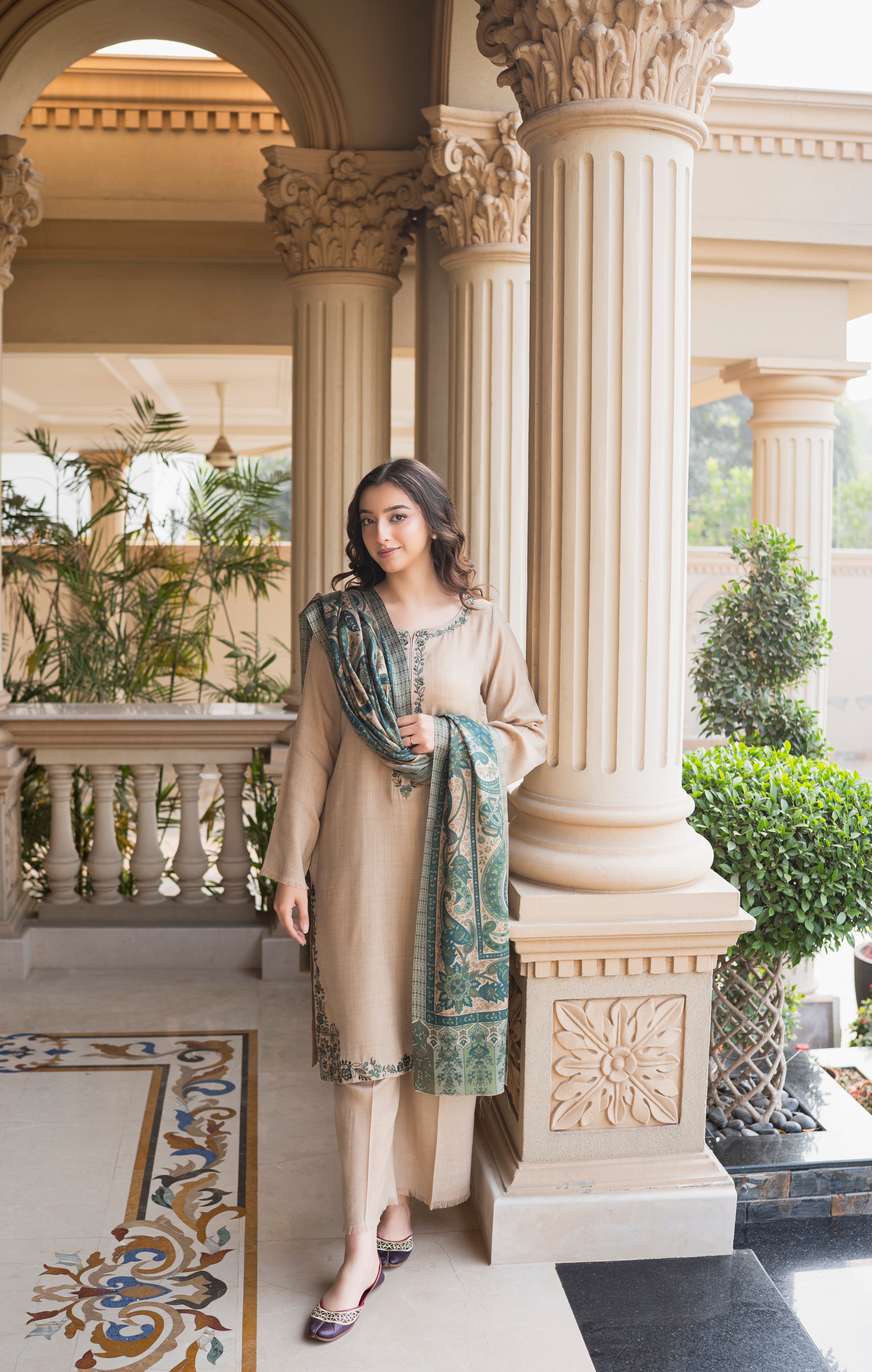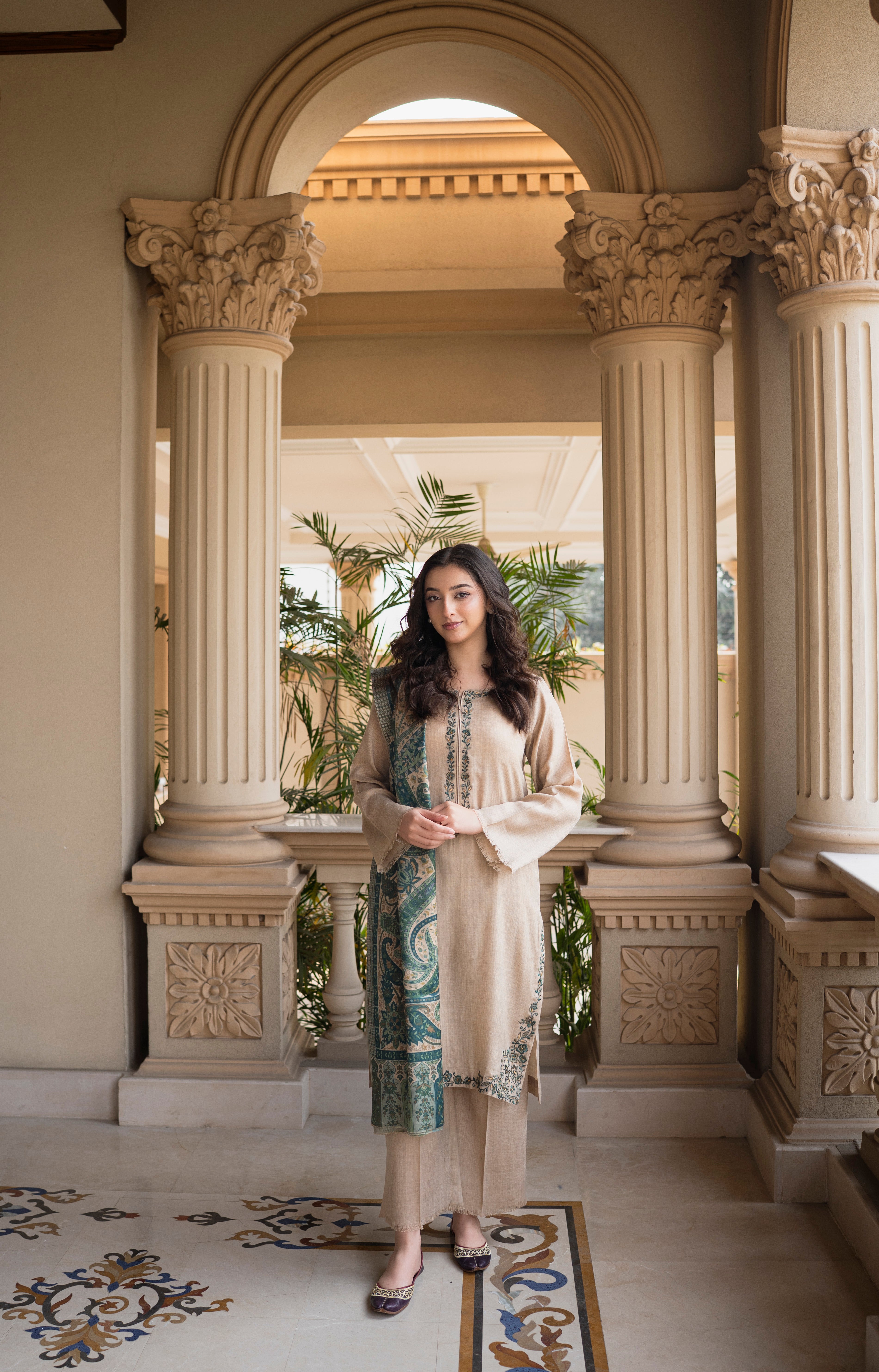 Cremé is a three-piece winter outfit from Aisling by Nirmal’s Pashm Pashmina Edit 2026. The suit is made in Pashmina, featuring fine embroidery along the neckline and borders with a clean, straight silhouette. It is paired with a matching straight trouser that offers a comfortable and neat fit. The look is completed with a coordinated Pashmina shawl, designed with woven patterns that add depth to the outfit. The soft crème tone makes this article suitable for winter wear, daytime gatherings, and casual to semi-formal occasions.