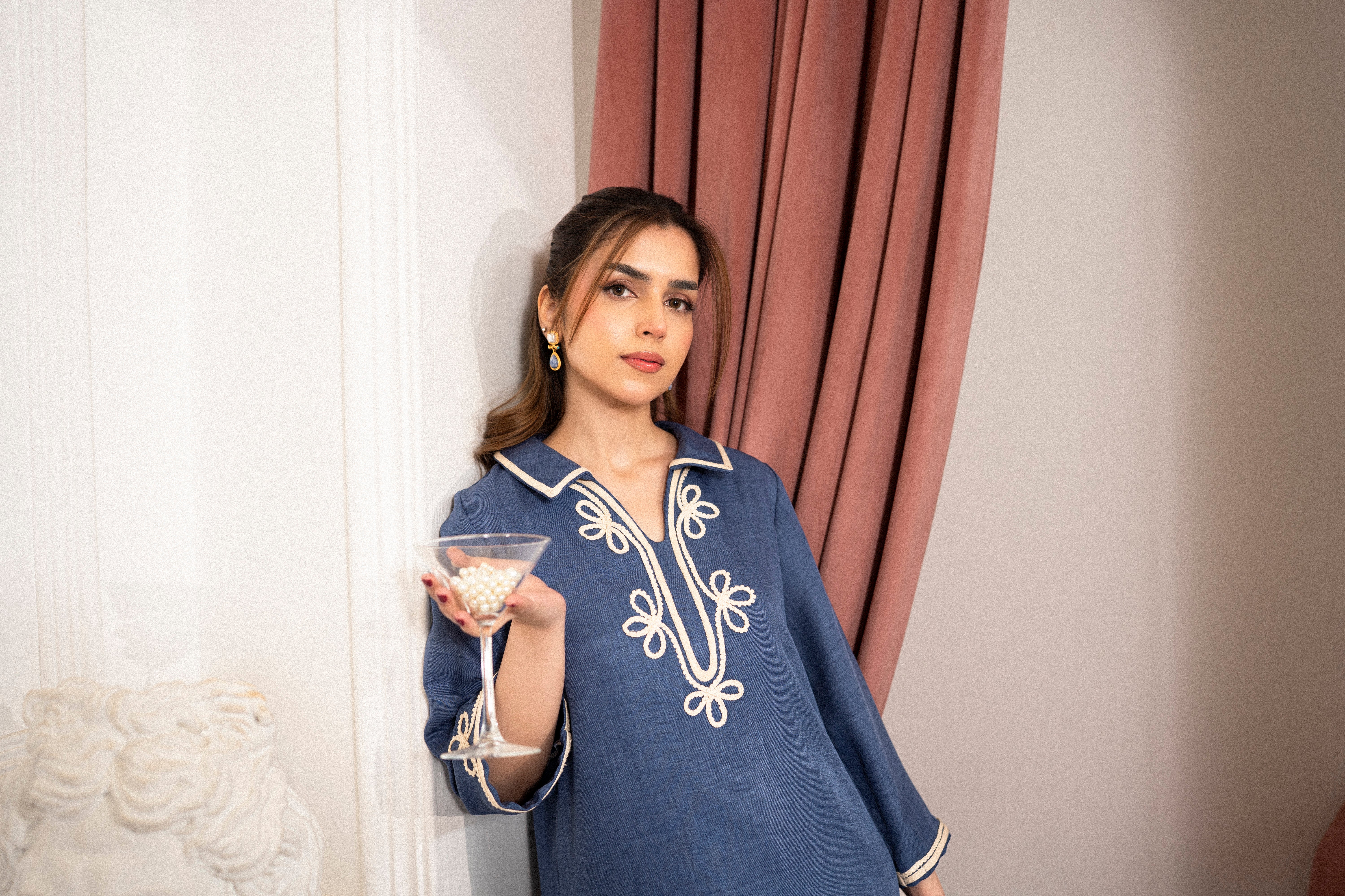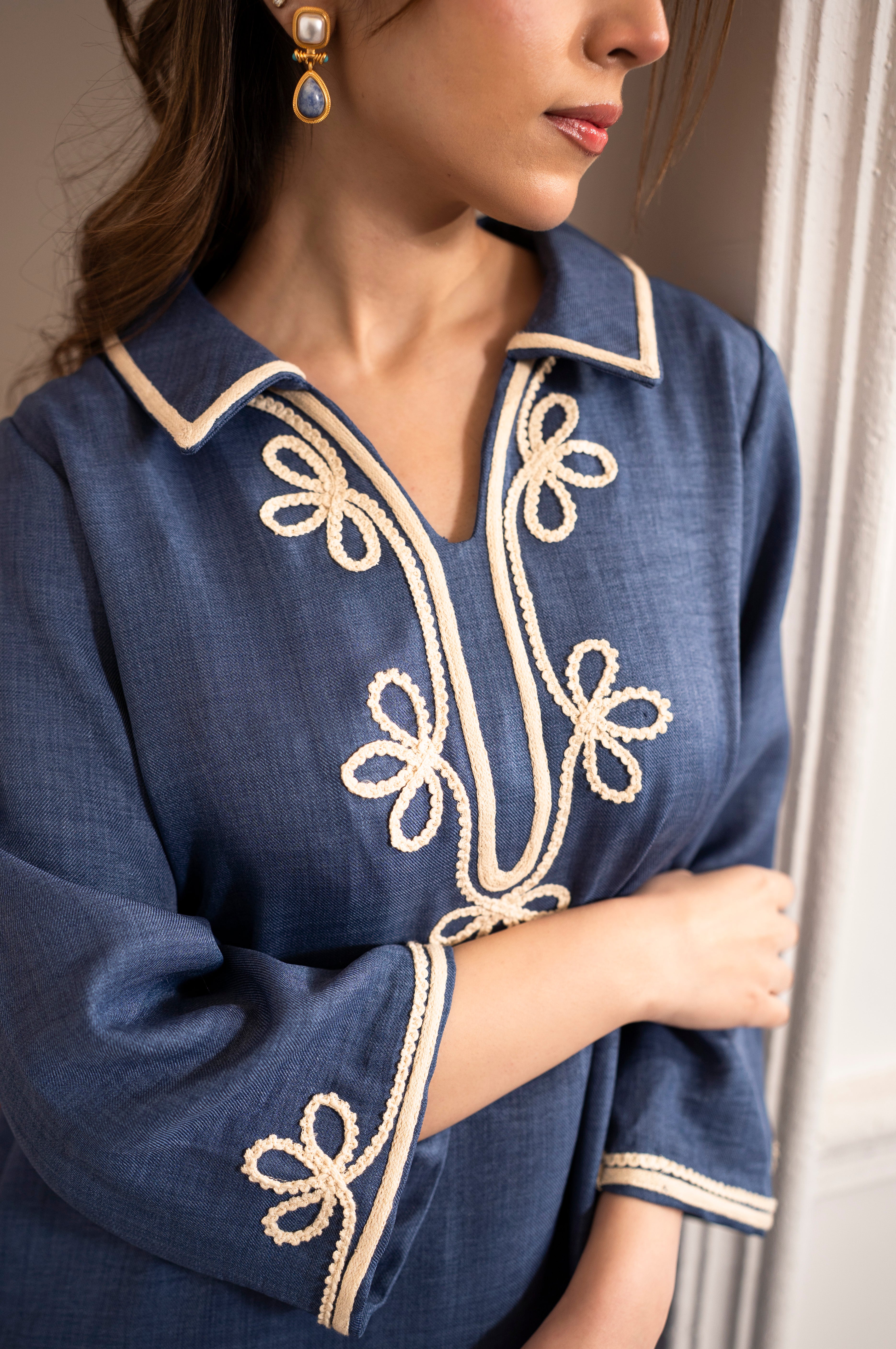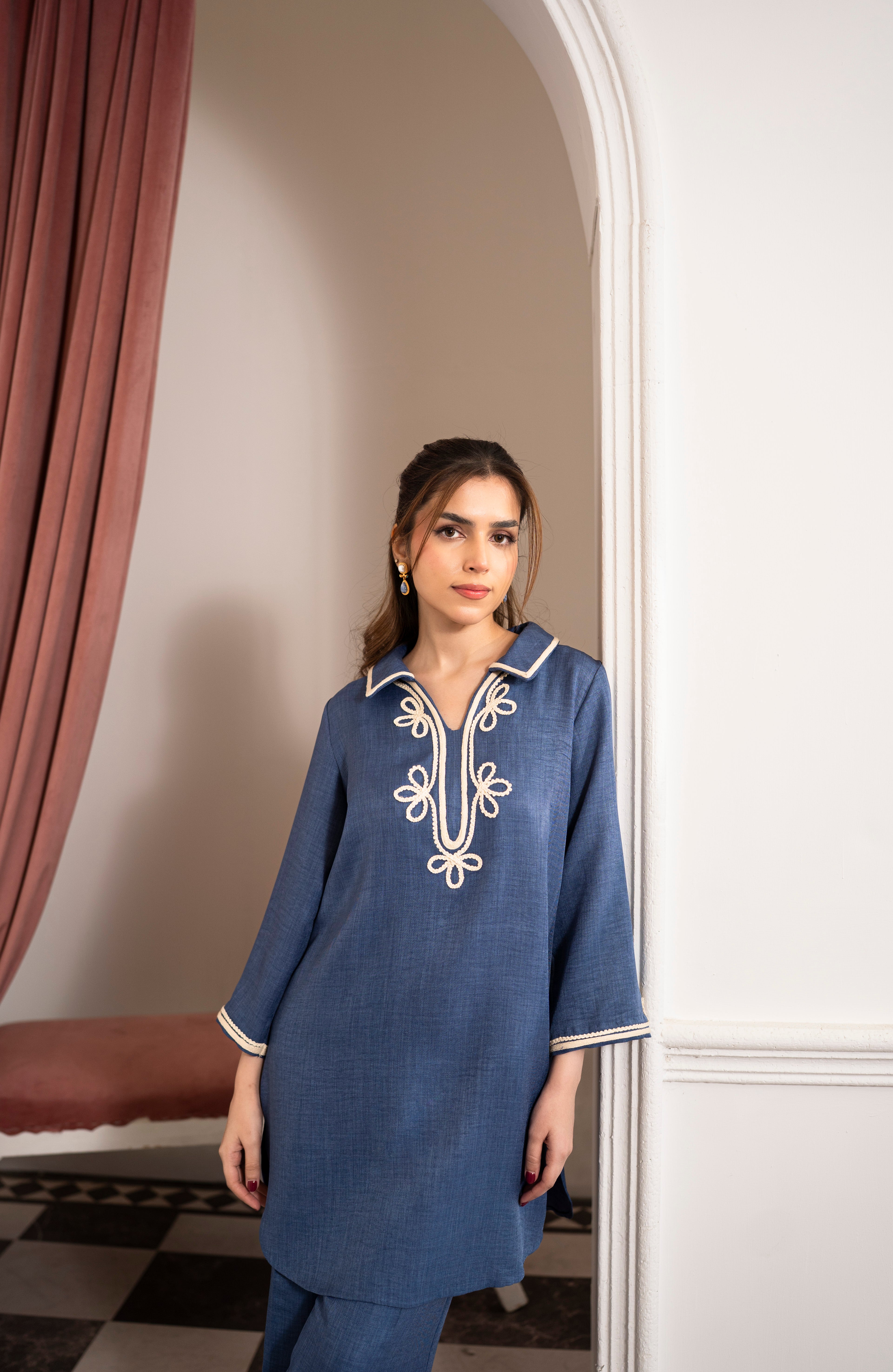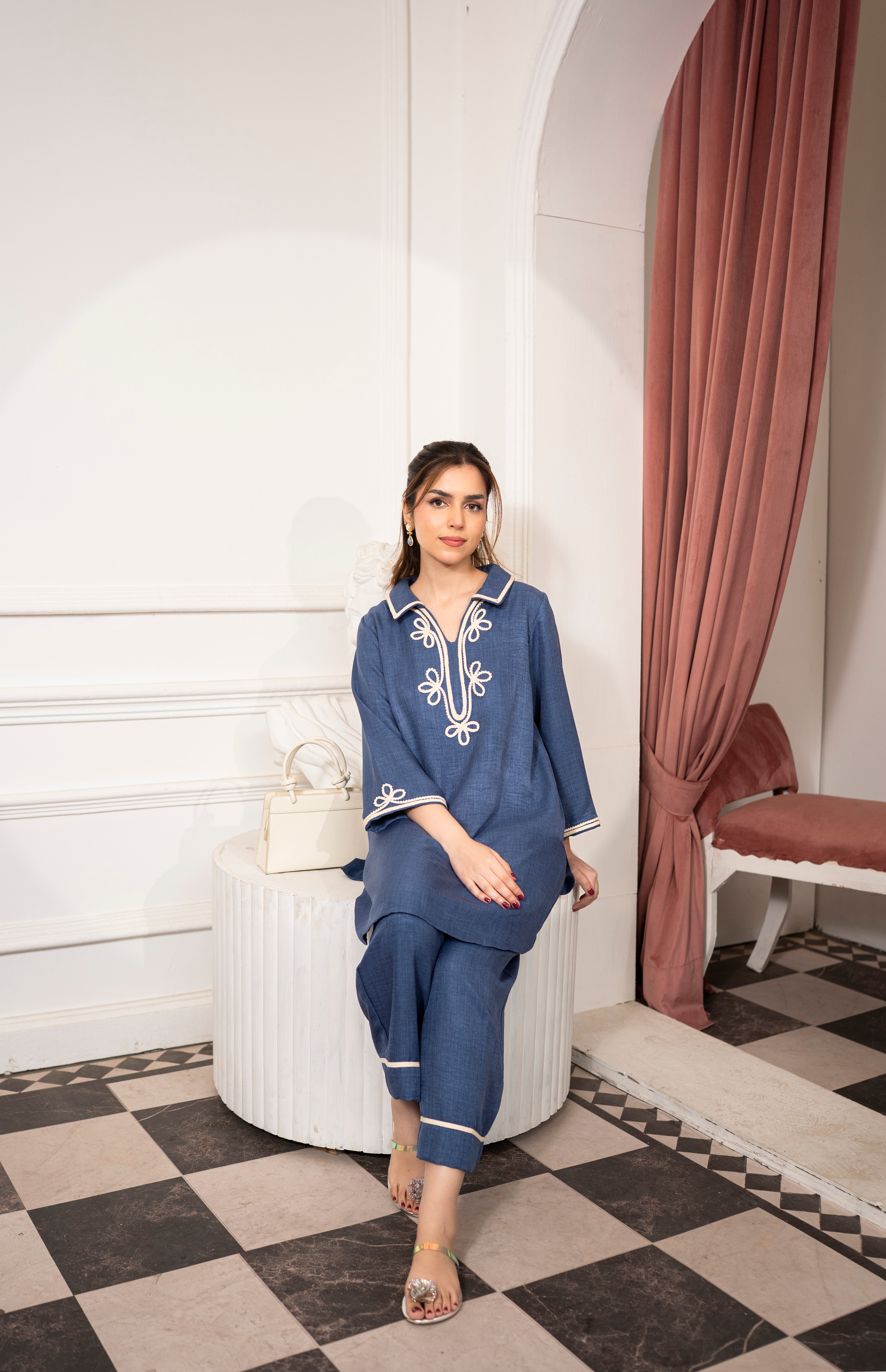 Elara in denim blue is all about comfort with a modern feel. The wool mareena fabric offers a smooth finish and easy movement, making this suit a reliable choice for everyday wear that looks neat without feeling overdone.