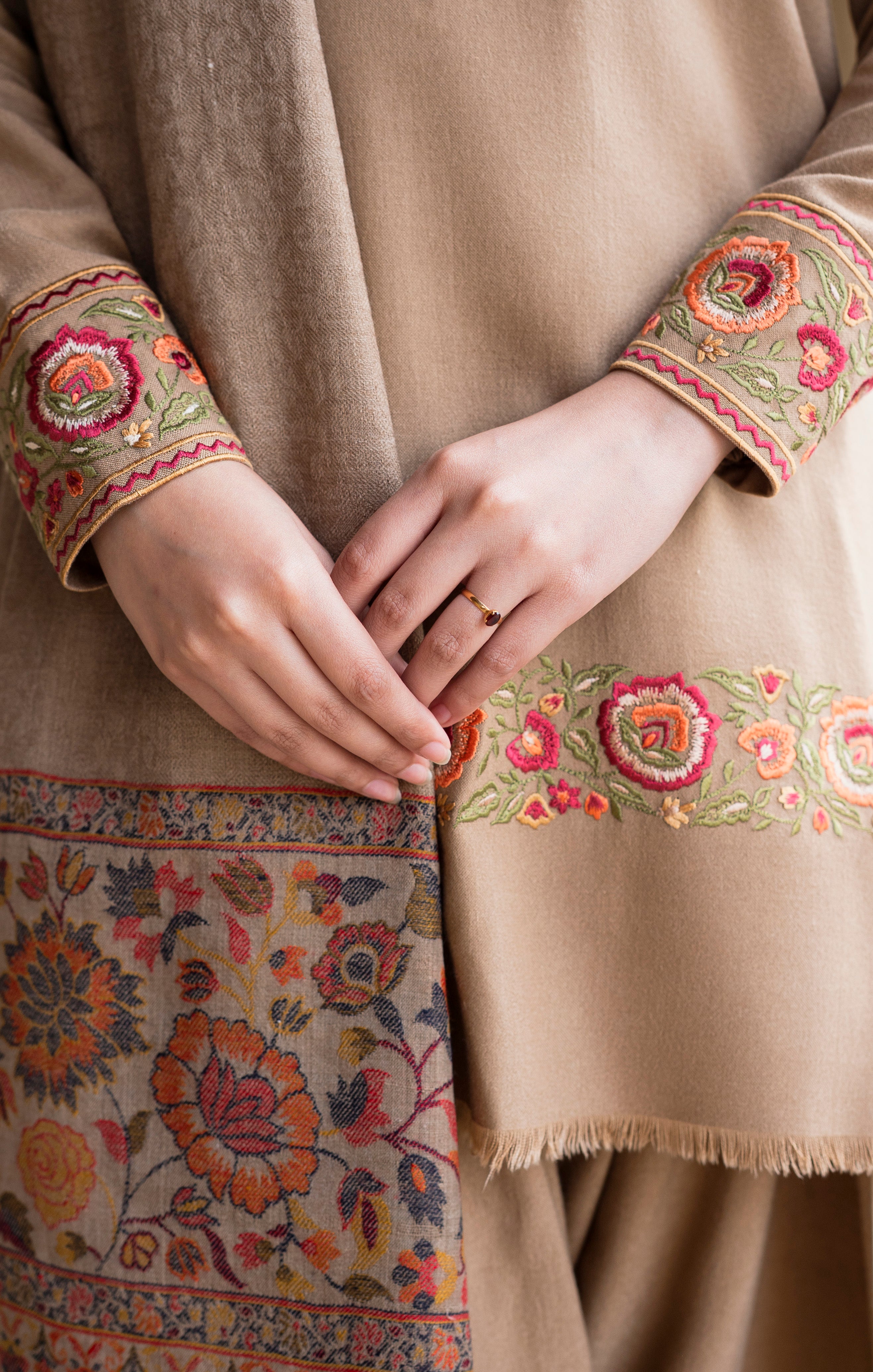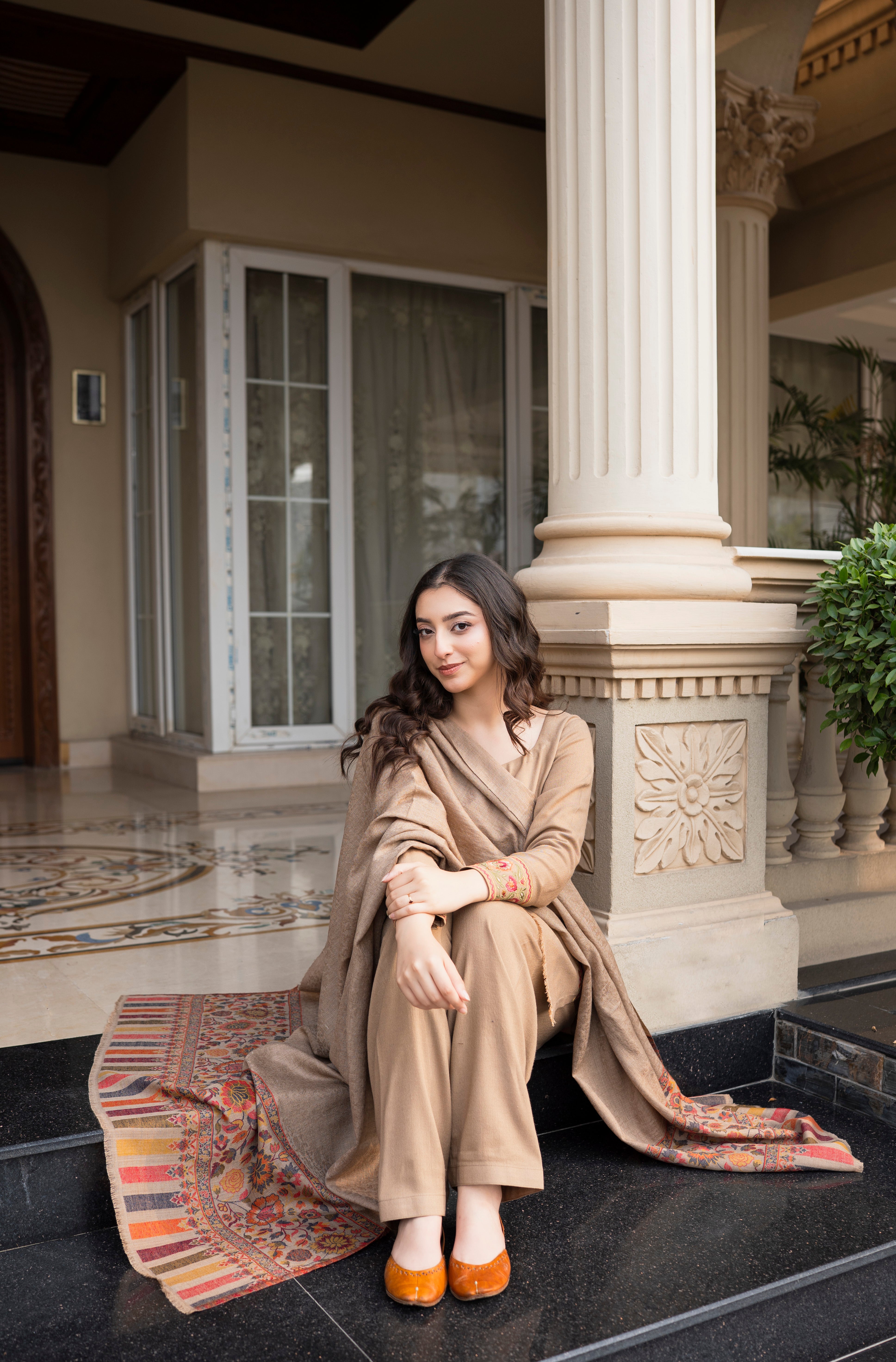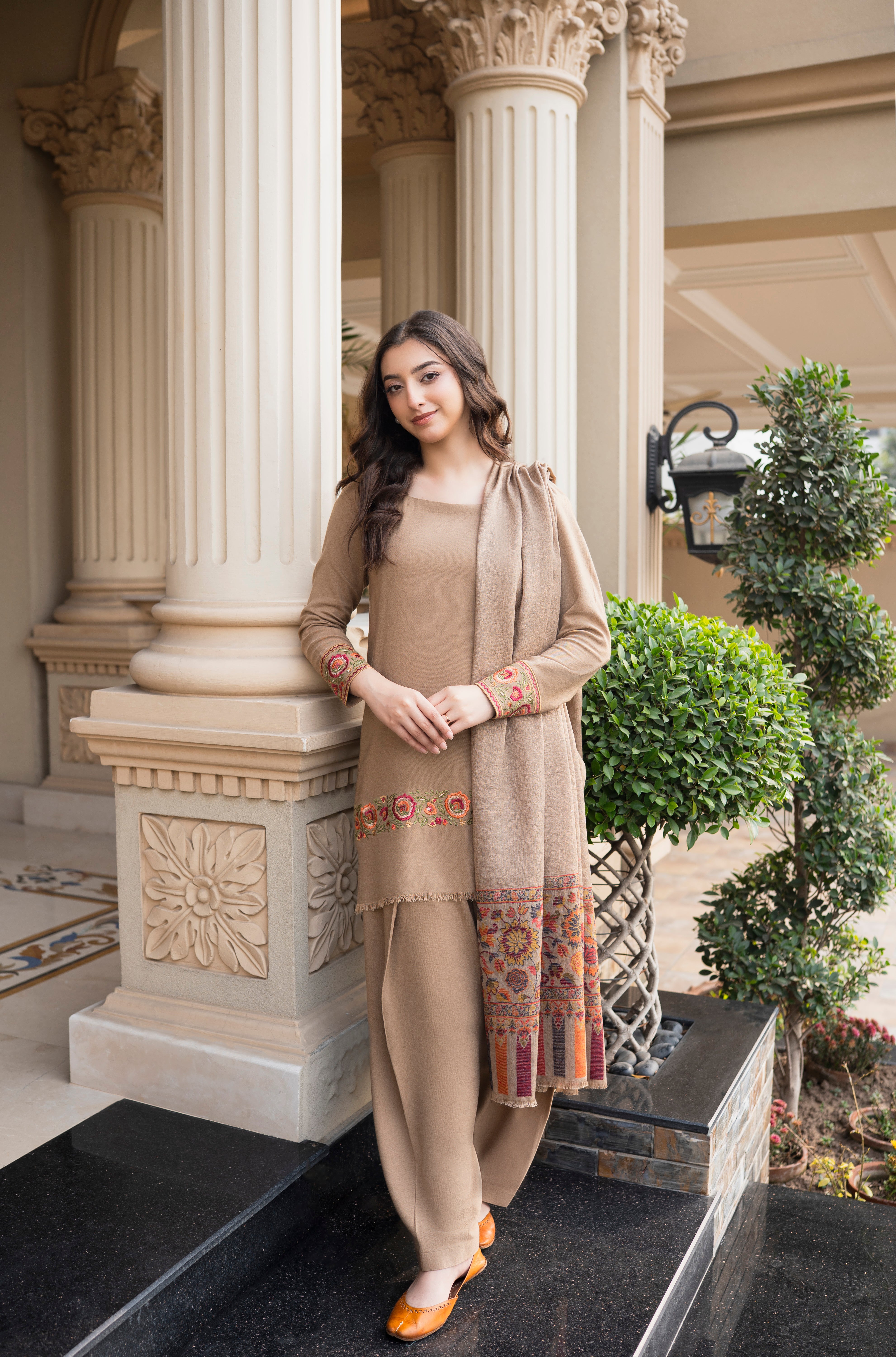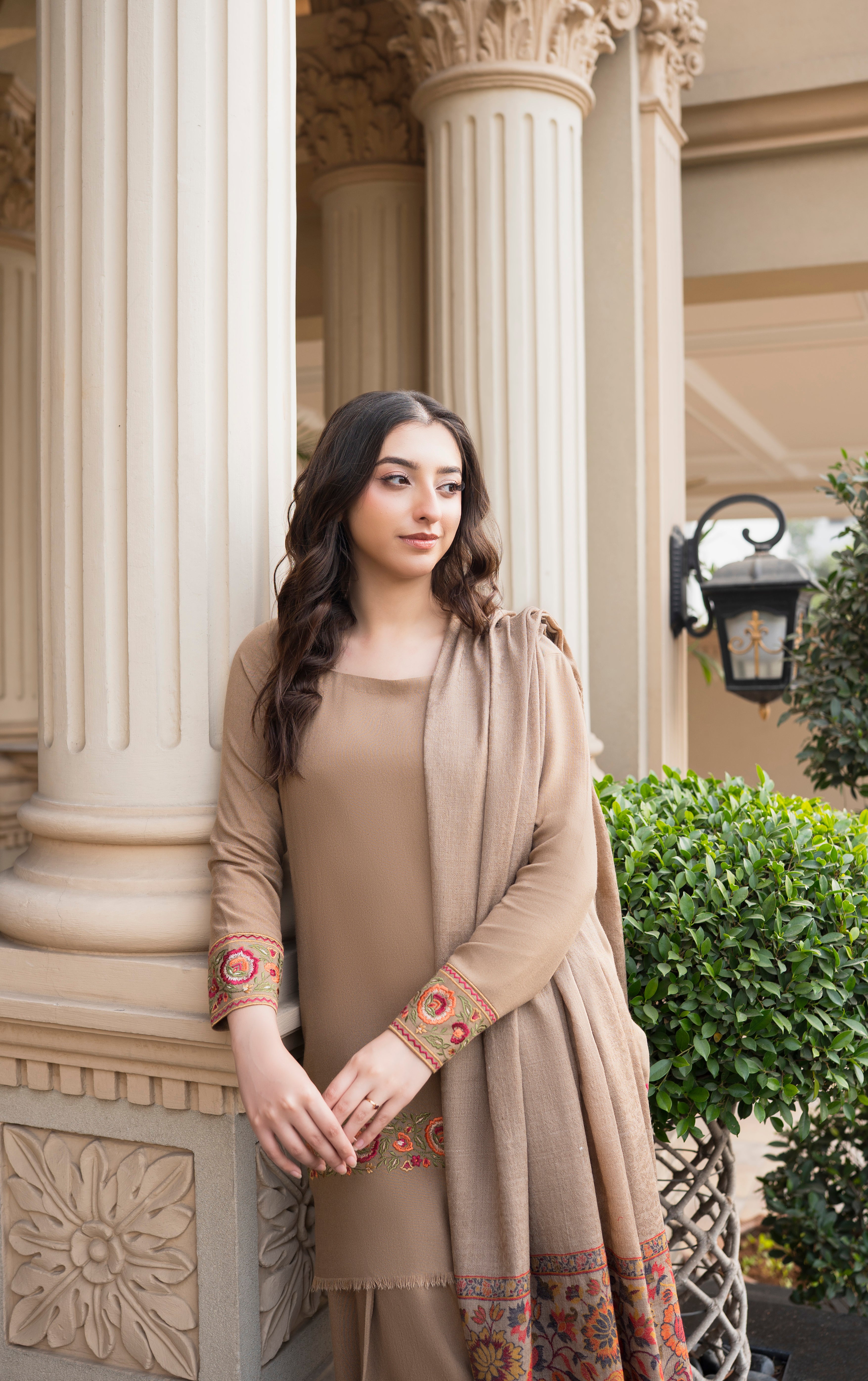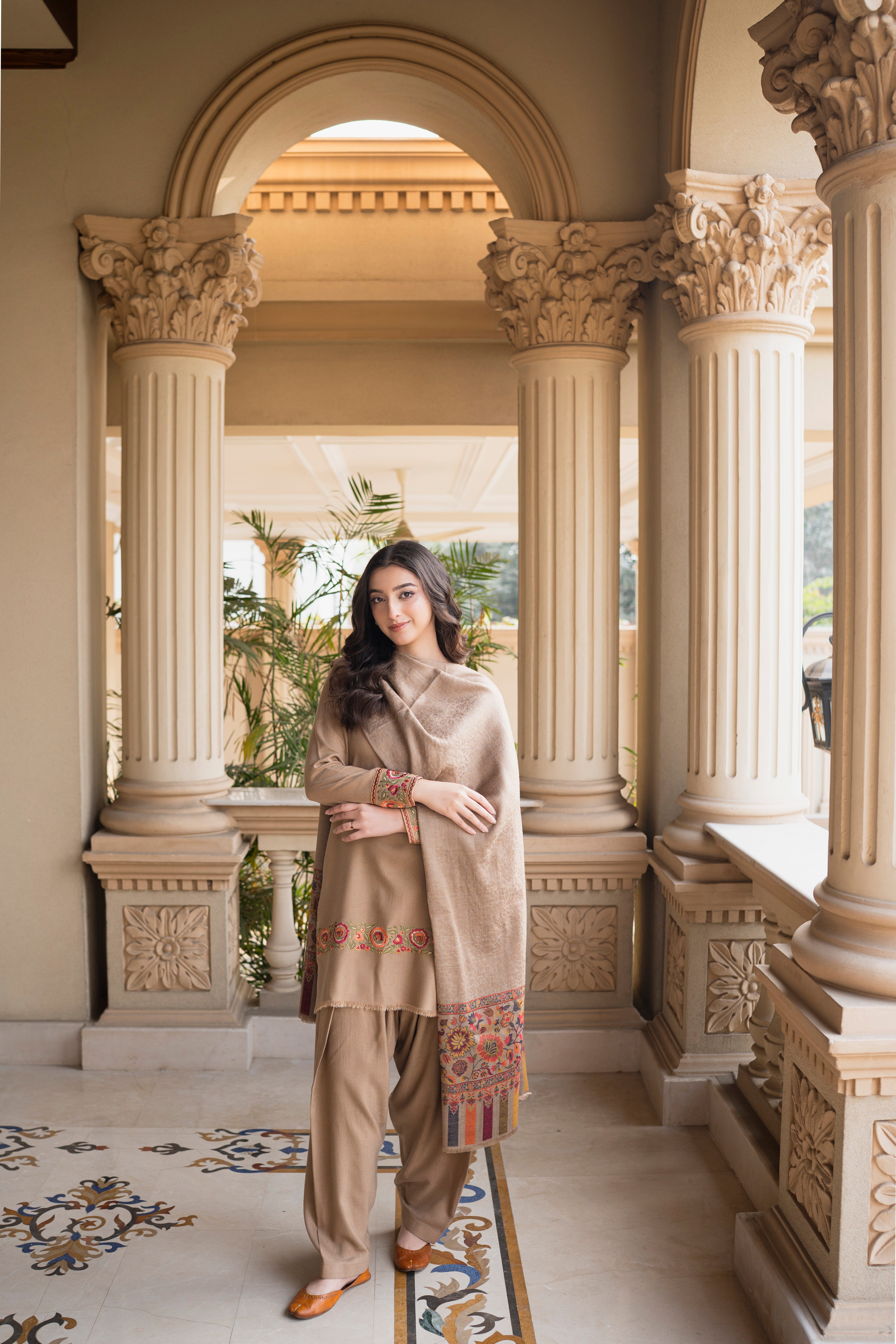Latté is a three-piece winter outfit from Aisling by Nirmal’s Pashm Pashmina Edit 2026. The suit is made in Peach Wool and features subtle embroidery on the sleeves and lower hem with a clean, straight silhouette. It is paired with a matching Peach Wool shalwar that offers a comfortable and relaxed fit. The look is completed with a coordinated Pashmina shawl, finished with detailed woven patterns along the borders. The soft latté tone makes this article suitable for winter wear, everyday use, and casual to semi-formal occasions.